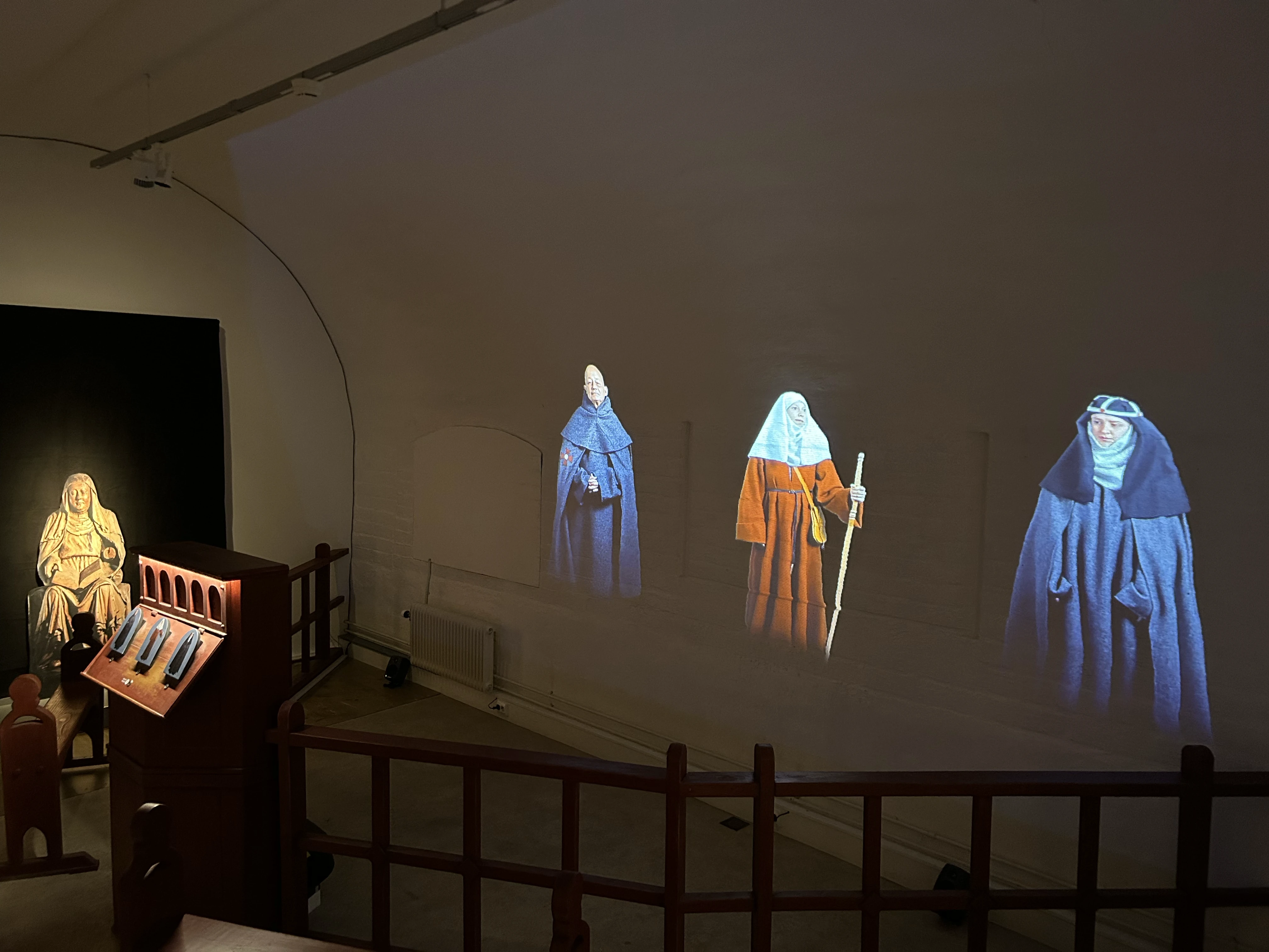 När Drakryggen kom in i projektet visste vi att upplevelsen skulle vara både immersiv, i meningen att besökaren ska känna att den står framför riktiga historiska människor och att känslan när man går omkring i 3D-modellen av klosterkyrkan från 1470-talet är realistisk. Tanken var att besökarna skulle uppleva tidsresan som om de verkligen var inne i den och känna sig omgivna av miljön och berättelsen. Därför föll valet på en projektor som kunde projicera på hela rummets vägg hela vägen upp i det välvda taket. En annan input var att installationen skulle vara interaktiv, så att besökaren kan påverka vad den tar del av. Efter mycket diskussioner kring vad som var väsentligt så valde vi att nöja oss med tre enkla knappar för de tre perspektiven då vi konstaterade att det viktiga var inte tekniken i sammanhanget utan att ge en genuin historisk känsla via tidsenligt snickrade möbler, målade ikoner ovanför knapparna och sätta fokus på människoödena i varje perspektiv. Tack vare duktiga regissörer som koordinerade inspelningar med skådespelare, bollade manus och ljudsatte med hjälp av 3D-modellens historiskt korrekta nunne- och munksång blev också upplevelsen fokuserad på varje karaktärs historia.